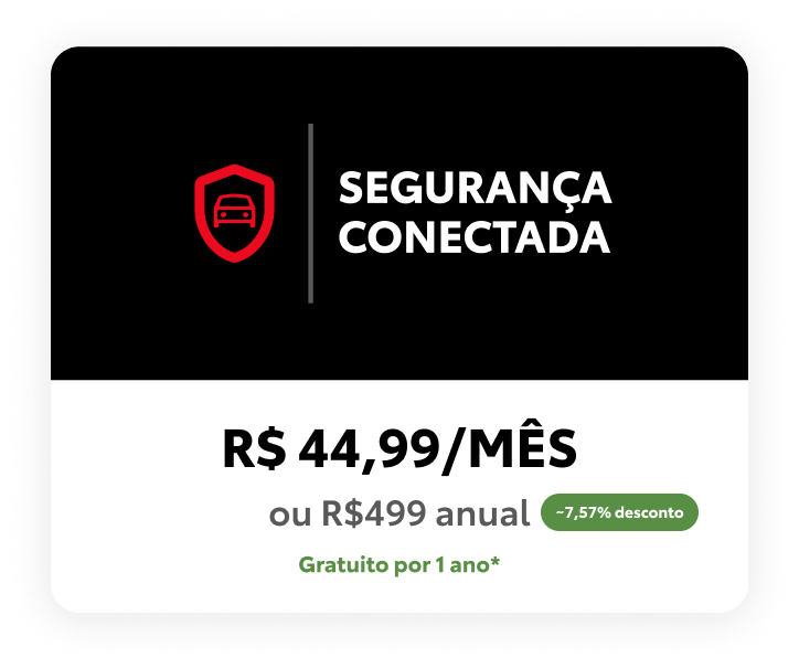 *Após o período gratuito, o plano Segurança Conectada custará R$44,99 ao mês ou R$499,00 por 1 ano, dependendo da forma escolhida. Para ter a gratuidade de 1 ano, é necessário adquirir um modelo Conectado, realizar a ativação na concessionária, baixar o app Toyota e informar um cartão de crédito válido.