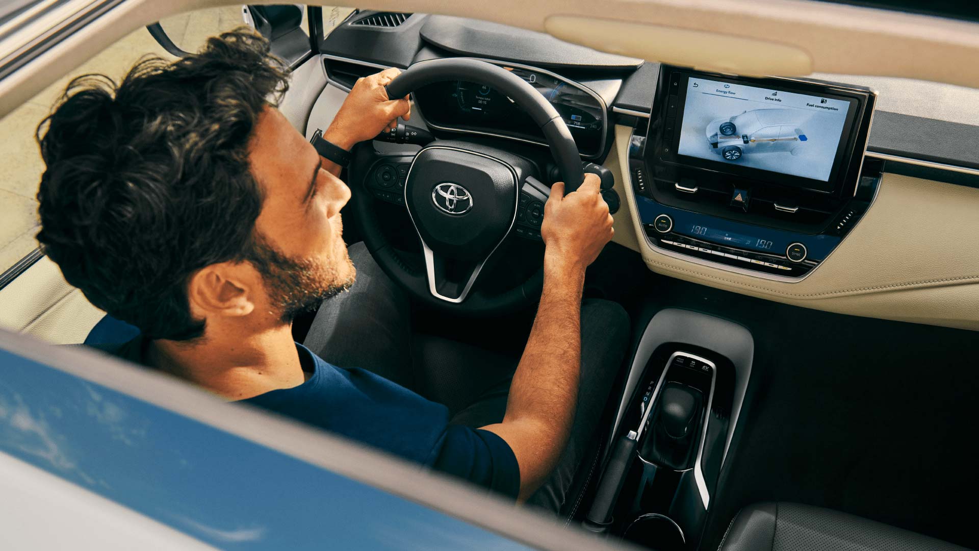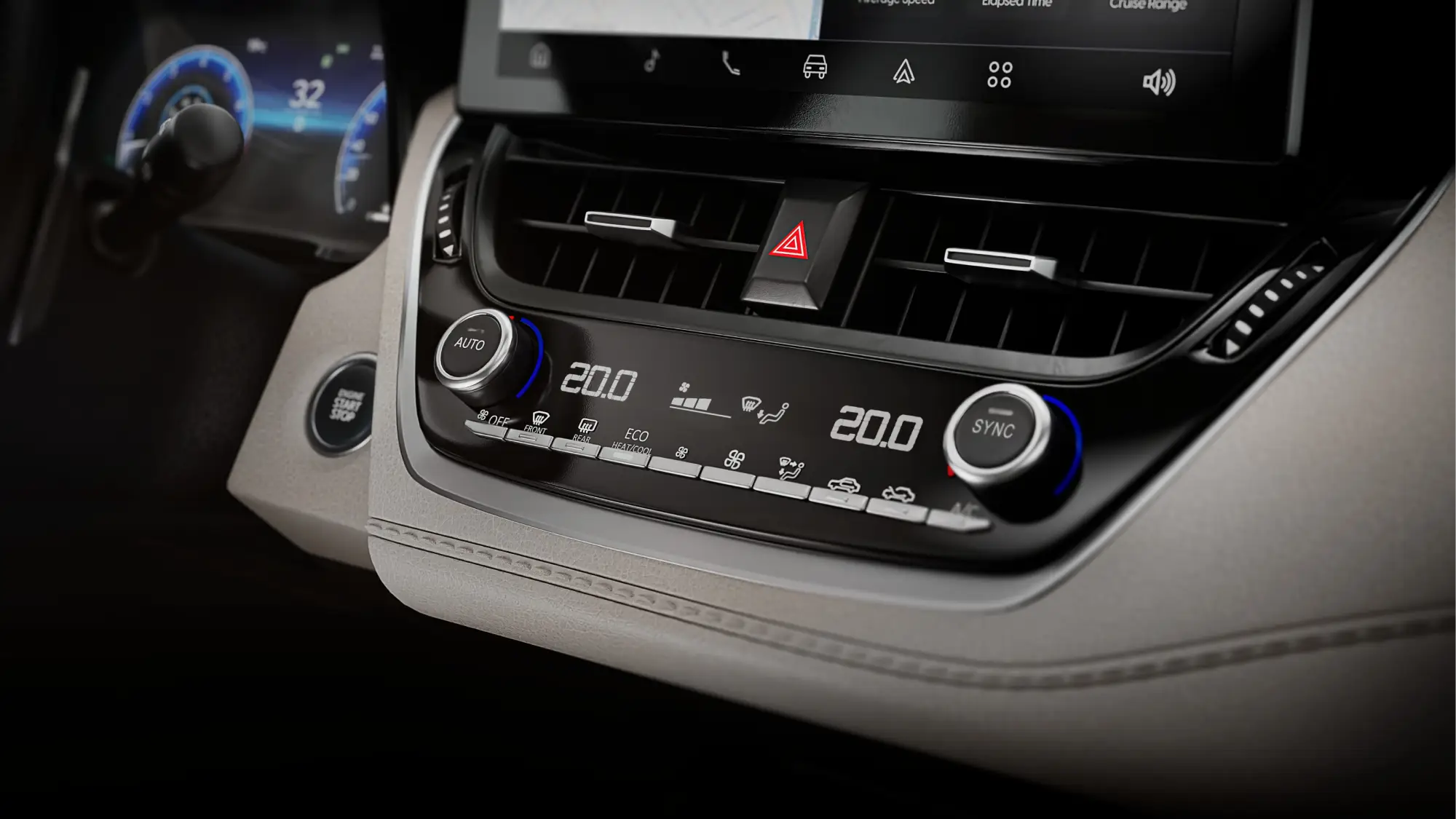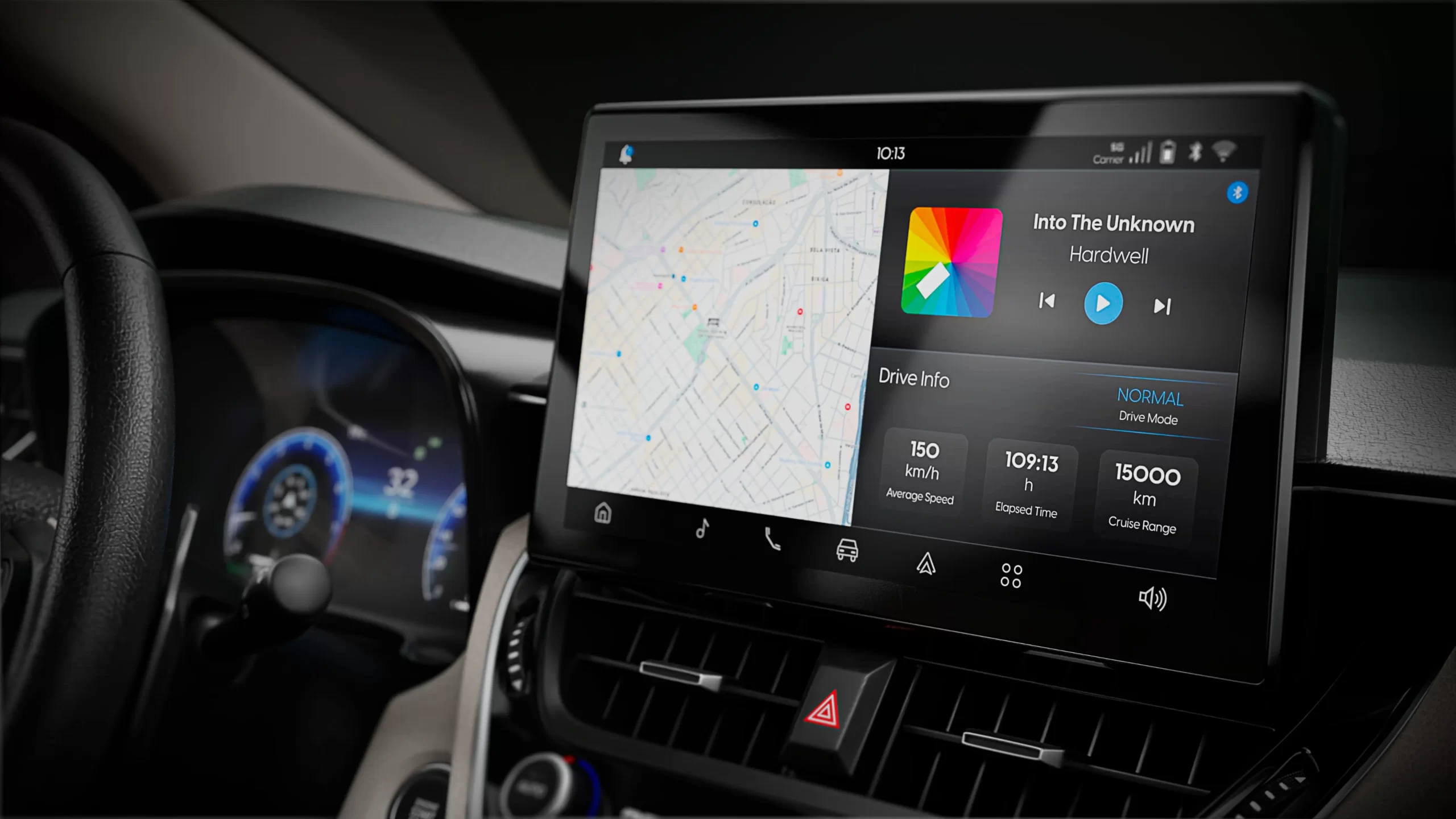 Uma tela ampla de 10.1” para melhor visualização de mapas, mídia e funções do veículo, com design moderno e alta definição.